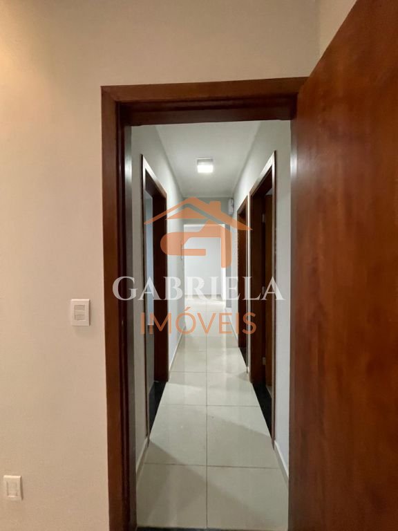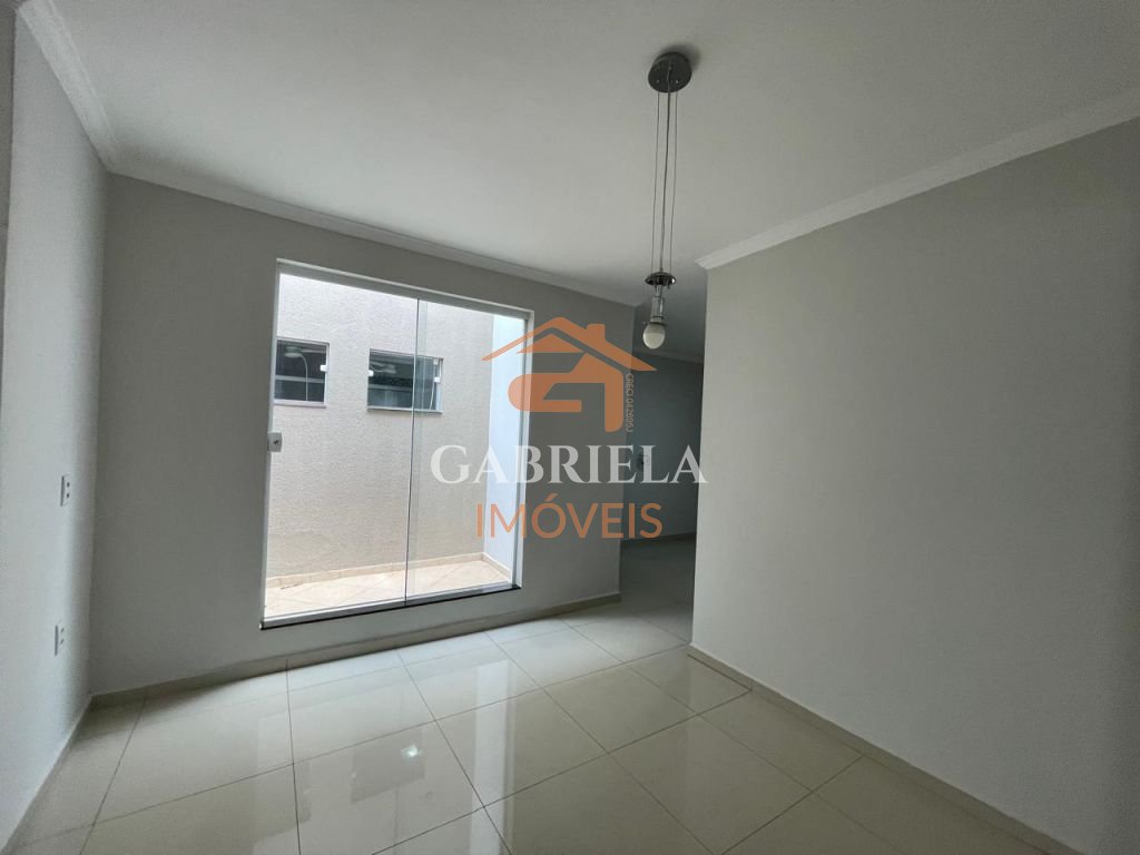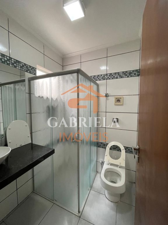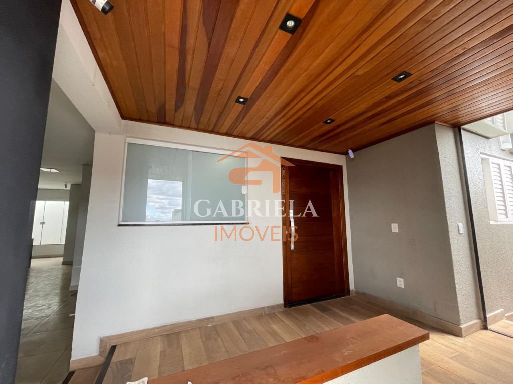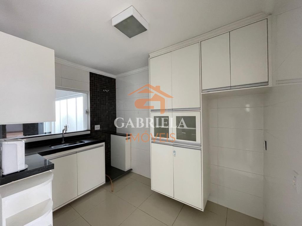 Casa possui uma grande área de lazer com churrasqueira, quartos espaçosos, ármarios na cozinha e garagem coberta para dois carros.